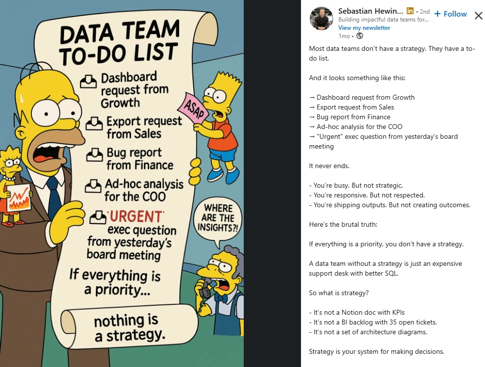 Die Leute folgen Sebastian, weil er Datenstrategien einfach, visuell und manchmal lustig macht. Seine Beiträge verwenden Memes und Popkultur, um ernste Themen wie KI-Automatisierung oder fehlerhafte Datenteamstrukturen zu enthüllen. Anstatt Vorträge zu halten, lädt er sein Publikum ein, zu lachen, zu lernen und ihre Prozesse zu überdenken. Diese Mischung aus Expertise und Humor macht seine Inhalte nicht nur aufschlussreich, sondern auch einprägsam, ein seltenes Gleichgewicht in der Datenwelt.