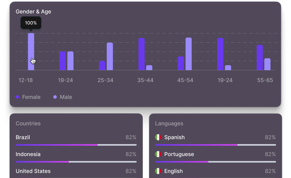 Ein Blick auf Social-Media-Seiten reicht nicht aus. Favikon bietet Ihnen mit jedem Profil tiefere Informationen. Sie erhalten Echtheitswerte, Zielgruppendaten, Leistungsstatistiken, genaue Preisschätzungen pro Beitrag, Daten zu früheren Kollaborationen und vieles mehr.