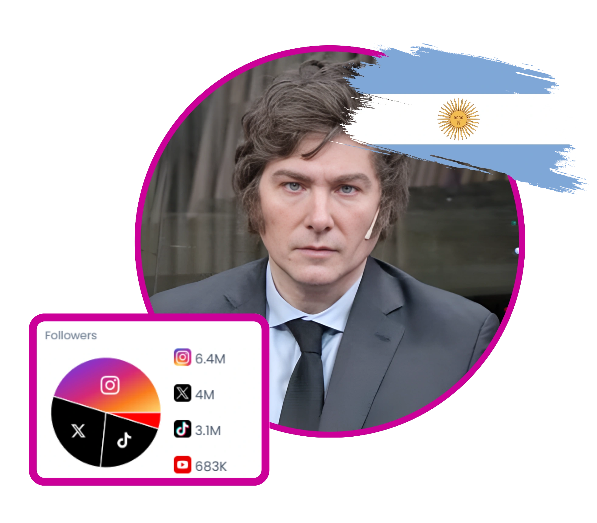 Javier Milei es el presidente de Argentina, conocido por sus políticas económicas libertarias y su fuerte liderazgo político. Su presencia en línea se centra principalmente en promover su agenda política, compartir actualizaciones sobre las acciones del gobierno y relacionarse con sus seguidores. Milei publica con frecuencia sobre reformas económicas, soberanía nacional y eventos políticos, y a menudo utiliza plataformas como Instagram, TikTok y Twitter para comunicarse directamente con el público. Su contenido incluye discursos políticos, anuncios de eventos y comentarios sobre temas de actualidad, enfatizando su visión para el futuro de Argentina.