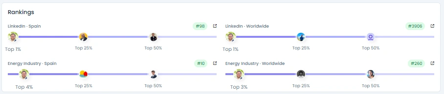 Está en torno a los 6.560 puntos de influencia de Favikon. Los seguidores crecieron orgánicamente de 18.800 a 32.700 en aproximadamente 3,5 años, una subida saludable sin picos sospechosos. La calidad de la participación es del 88, mientras que la calidad del contenido de las publicaciones es del 92 y la experiencia del 94. Las clasificaciones lo sitúan en el 1% más alto de LinkedIn en España y en el puesto #10 en la industria energética española, con una ubicación global en torno al porcentaje más alto.