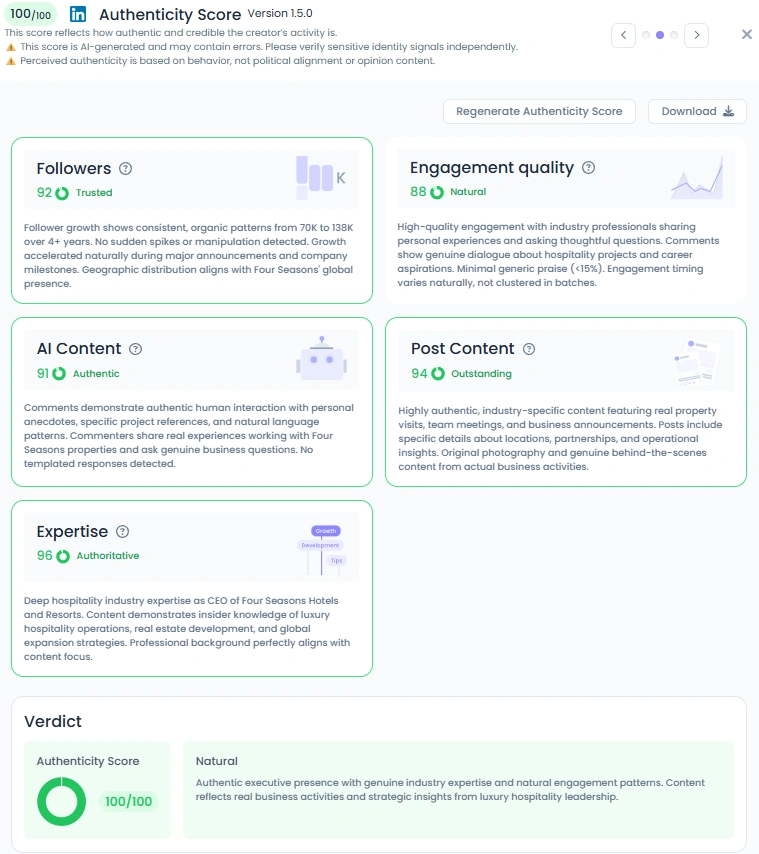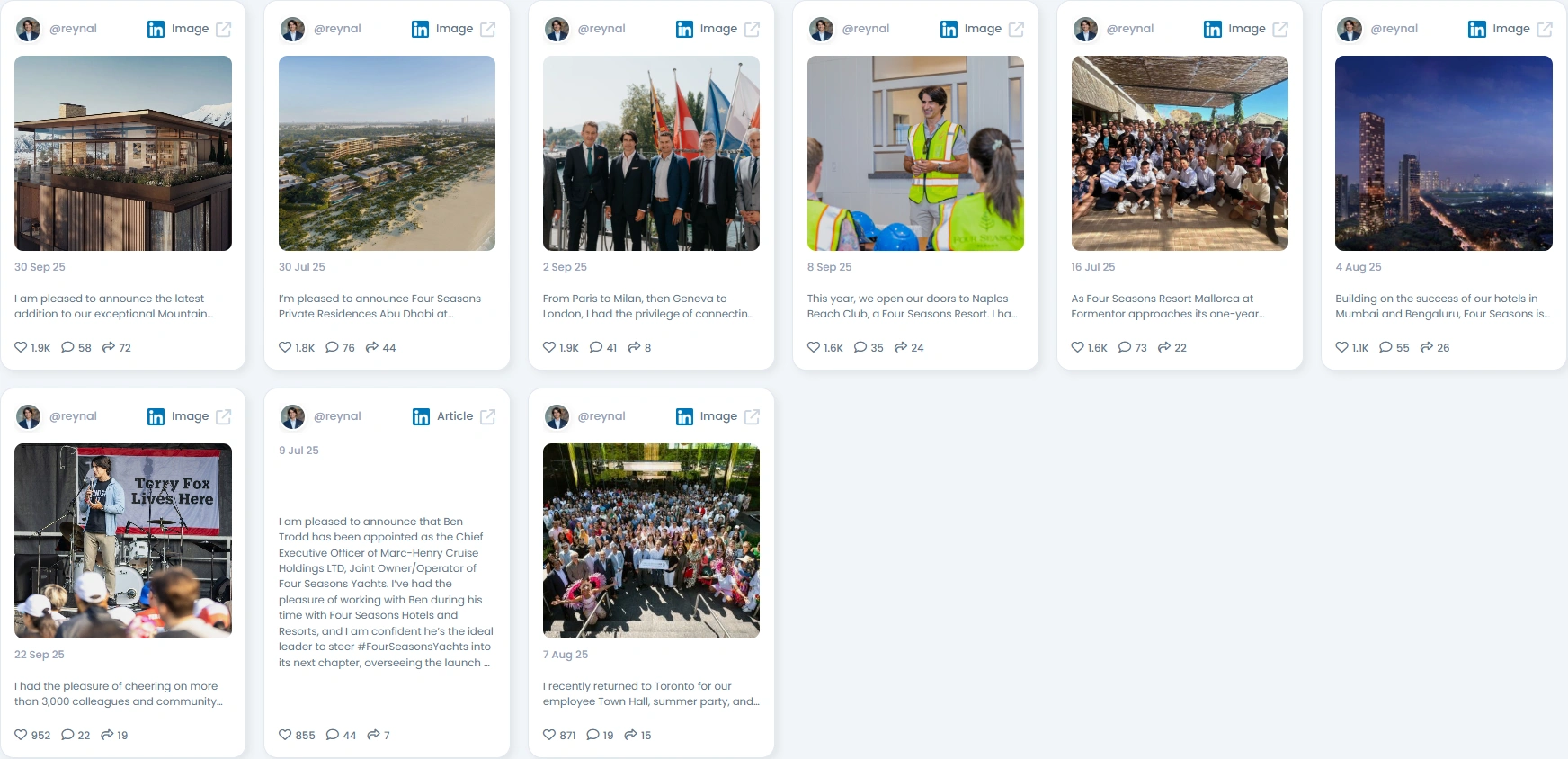With a perfect Autenticidad Score de Favikon de 100/100, la presencia en línea de Alejandro refleja una voz ejecutiva genuina. Sus publicaciones incluyen fotos entre bastidores de visitas a propiedades, anuncios de nuevos desarrollos y anécdotas personales de reuniones empresariales. La combinación de actualizaciones estratégicas y momentos auténticos con el personal y los huéspedes demuestra un estilo de liderazgo basado en la apertura y la credibilidad. Los seguidores pueden sentir que su contenido está diseñado con un toque personal en lugar de un filtro corporativo.