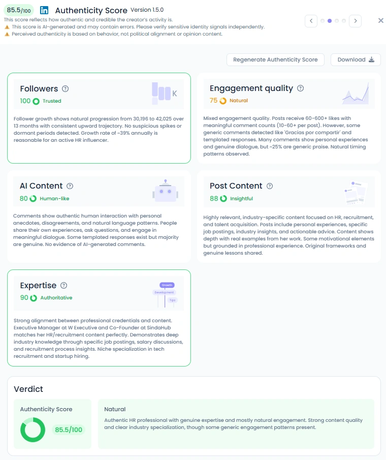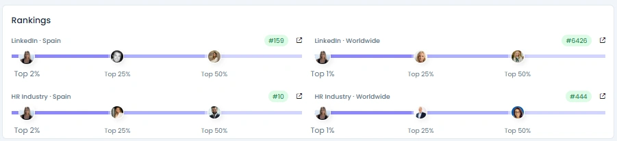 Los seguidores aumentaron de 30 196 a 42 025 en trece meses, aproximadamente un 39% de crecimiento anual con una curva constante. Su puntuación de influencia es de 7,107 puntos. La calidad de la interacción obtiene una puntuación de 75, mientras que el contenido de las publicaciones alcanza los 88 en cuanto a profundidad y utilidad. Las clasificaciones la sitúan en el 2% más alto de LinkedIn en España, en el 1% más alto del mundo y en el 2% de la industria de RRHH en España.