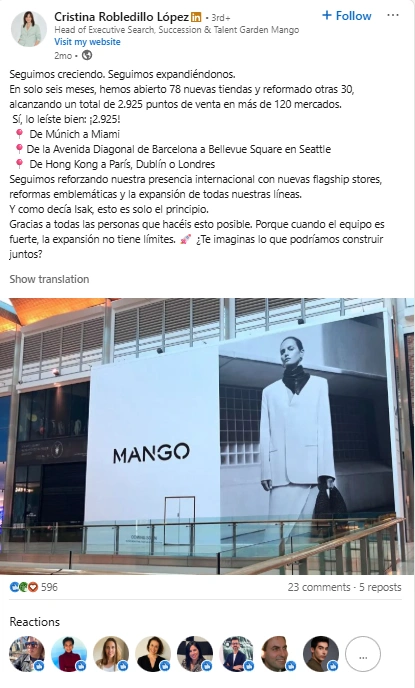 Cristina es una líder sénior de talento en MANGO y se centra en la búsqueda de ejecutivos, la asistencia técnica global y la DEI. Desarrolló su carrera en el comercio minorista de moda, donde la velocidad, la escala y la marca importan tanto como la habilidad. En LinkedIn, comparte guías de contratación, lecciones de liderazgo y actualizaciones desde la apertura de tiendas hasta la cultura de la sede central. Un punto destacado reciente: la expansión de MANGO a 2925 puntos de venta en 120 mercados, junto con un agradecimiento a los equipos que están detrás de este crecimiento. También dirige «Diary of a Headhunter», una serie sencilla que convierte los momentos de reclutamiento diarios en ideas inteligentes para llevar. El posicionamiento es nítido: recursos humanos estratégicos con la urgencia de un minorista.