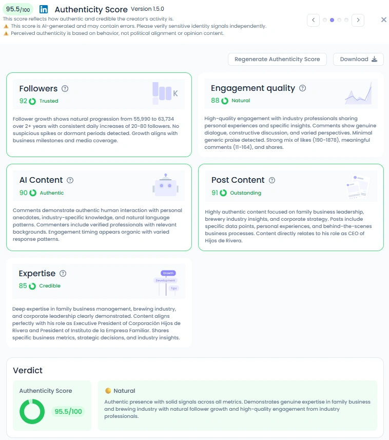 Ignacio tiene un Puntuación de autenticidad de Favikon de 95,5100, lo que demuestra que la confianza es su moneda más fuerte. Su base de seguidores creció naturalmente a partir de 55 000 sobrepasar 63.000 profesionales en solo dos años. Cada publicación refleja su genuina pasión por las personas y la sostenibilidad. Sus secciones de comentarios están llenas de intercambios significativos de profesionales verificados que valoran sus ideas de liderazgo. La comunicación de Ignacio se siente transparente y se basa en la experiencia real.
