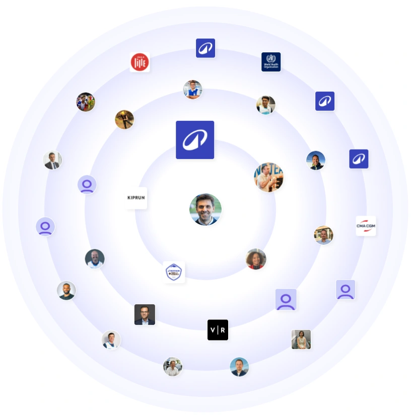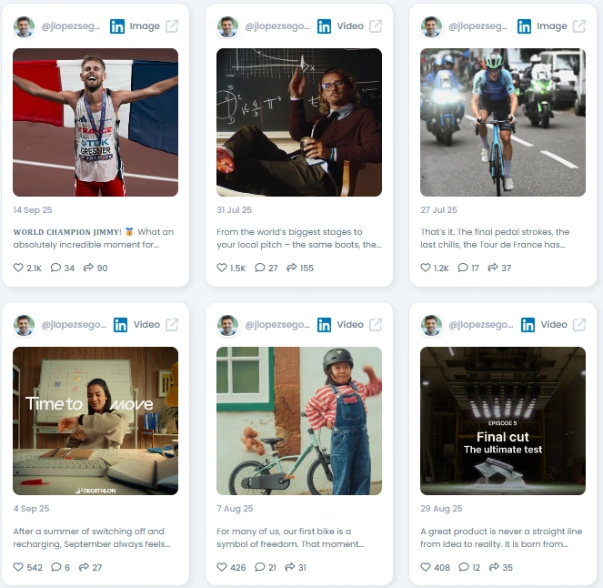Su círculo está repleto de marcas de Decathlon, equipos de rendimiento y marcas asociadas como KIPRUN. Verás a líderes de logística como CMA CGM, ejecutivos de la industria y medios deportivos. Los organismos de salud y normalización aparecen junto a los innovadores del comercio minorista. La red combina atletas, ingenieros y profesionales de la cadena de suministro, lo que le da a su mensaje tanto alcance como confianza técnica.