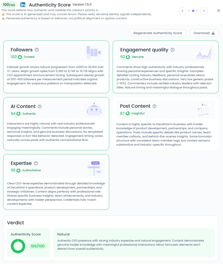 Favikon lo califica con una autenticidad de 100/100. Los comentarios provienen de líderes verificados que comparten notas sobre productos, historias de logística y debates constructivos. Las publicaciones mezclan vídeos entre bastidores, momentos destacados de eventos y aplausos del equipo. Parece una puerta abierta al progreso de los barcos de Decathlon.
