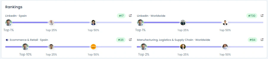 Los seguidores aumentaron de 4.565 a 30.914 en más de tres años con patrones orgánicos y constantes. Su puntuación de influencia es de 7.134 puntos. La calidad de la participación se sitúa en 92, el contenido de las publicaciones en 87 y la experiencia en 95. Las clasificaciones lo sitúan en el puesto #17 en España en LinkedIn y en el 2% más alto del mundo en fabricación, logística y cadena de suministro.