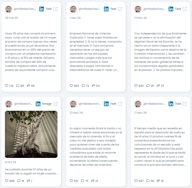 Mikel Echavarren es un ejecutivo inmobiliario sénior mejor conocido por liderar Colliers España y Portugal y por asesorar en operaciones complejas. Durante tres décadas, ha trabajado en ciclos, reformas y cambios de financiación que dieron forma al mercado español. Su feed mezcla gráficos frescos con experiencias vividas, desde anécdotas al inicio de su carrera en Arthur Andersen hasta notas personales sobre la disciplina y la paciencia aprendidas al cuidar un bonsái. Publica opiniones contrarias sobre la oferta, las normas fiscales y los incentivos, y luego las defiende en largos hilos de comentarios. Se posiciona como un operador del mercado que sigue creyendo que la política de vivienda puede ser práctica y justa.