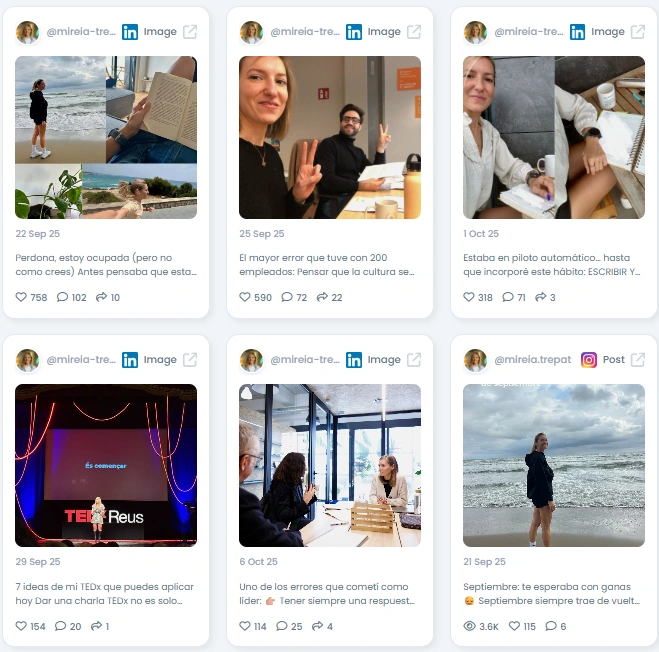 Favikon califica su autenticidad en 81,5/100. El ambiente coincide con el marcador. Fotos de la oficina, paseos por la playa con un libro, preparación para TEDx y clases sin procesar después de semanas difíciles. Es abierta sin ser performativa, y mezcla un liderazgo tranquilo con «esto es lo que cambié y por qué».