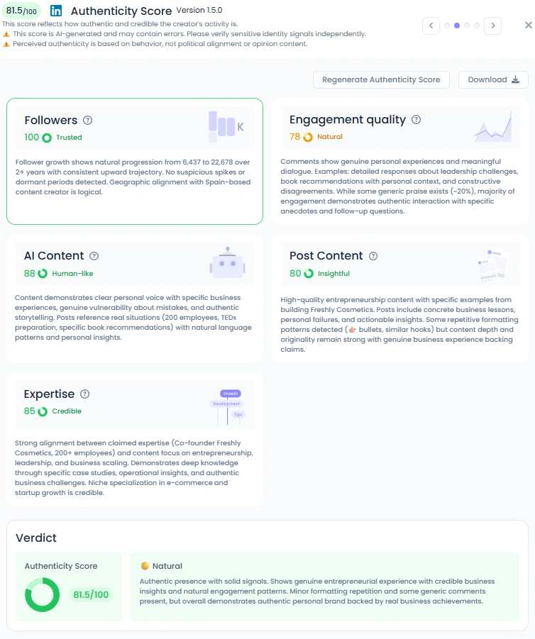 Su audiencia ha crecido de forma natural, pasando de unos 6.400 a 22.600 seguidores en poco más de dos años. La calidad de la participación se sitúa en el rango más natural, con respuestas reflexivas y preguntas de seguimiento. La calidad del contenido es reveladora y se basa en ejemplos y marcos concretos. Ocupa el 2% mejor en LinkedIn España y el 5% mejor en Startups y Emprendimiento a nivel nacional.