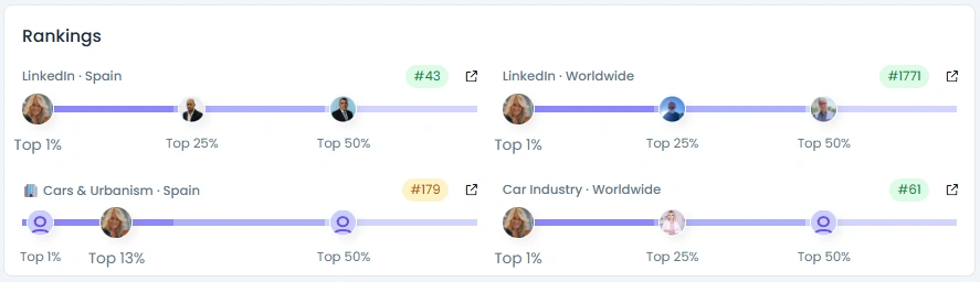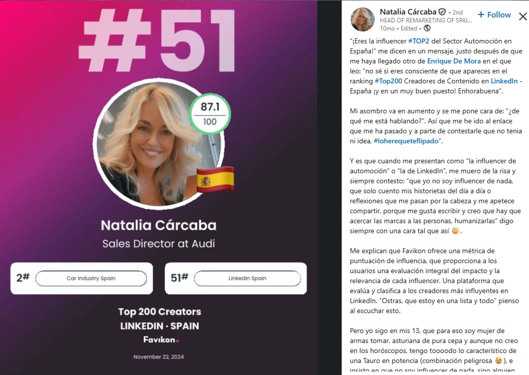 La audiencia de Natalia ha crecido constantemente hasta superar los 75 000 seguidores, lo que demuestra un compromiso constante y una progresión natural en los últimos dos años. Su puntuación de influencia de 7.118 puntos la sitúa en el 1% más alto de LinkedIn en España y en el 1% más importante de la industria del automóvil a nivel mundial. Sus publicaciones tienen un promedio de cientos de interacciones, lo que demuestra su capacidad para conectarse profundamente con su audiencia.
