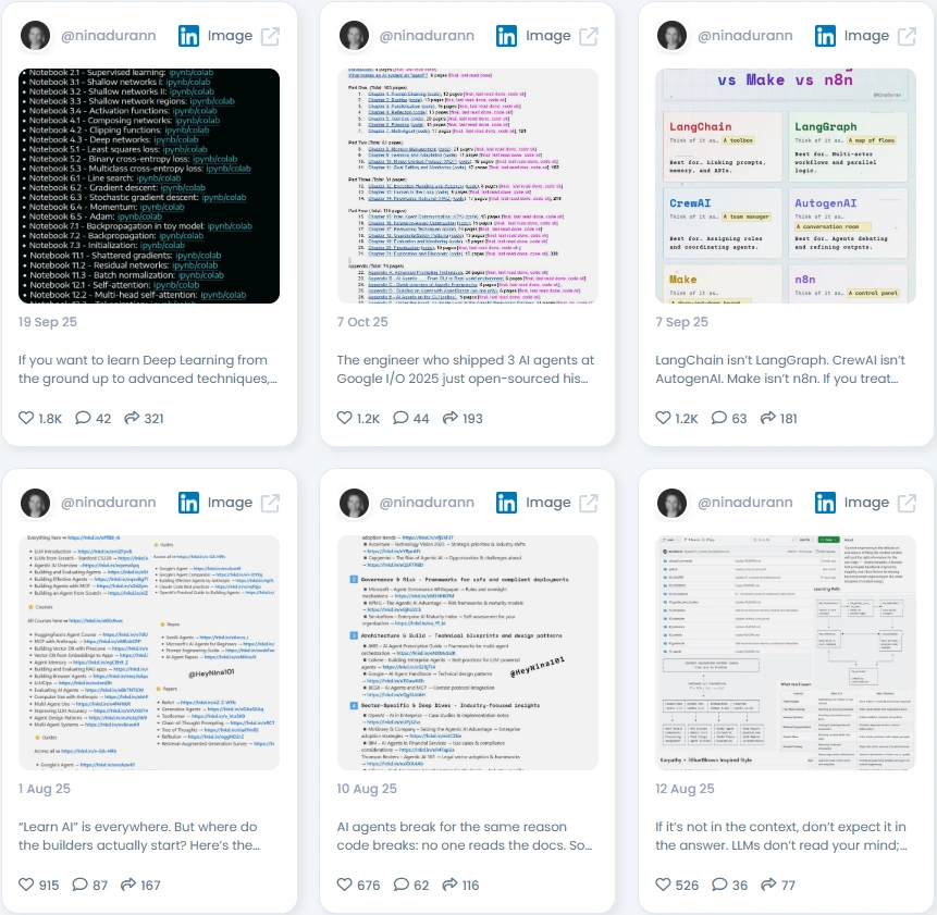 La gente escucha a Nina porque hace que las cosas complejas parezcan factibles. Su estilo de comunicación es claro, estructurado y nunca condescendiente. Ya sea explicando cómo funcionan los agentes de IA o compartiendo un repositorio de GitHub para principiantes, genera credibilidad a través de la claridad y los ejemplos prácticos. Sus publicaciones fomentan el diálogo, y los seguidores suelen hacer preguntas de seguimiento o aportar sus propias opiniones, lo que hace que su página parezca más un aula colaborativa que un feed.
