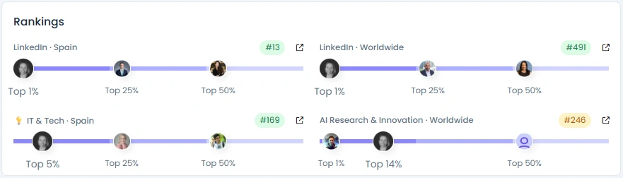 La comunidad de Nina en LinkedIn ha crecido hasta superar los 41.000 seguidores, con un impulso constante y orgánico en los últimos dos años. Se encuentra entre el 1% de los creadores más importantes de España y el 5% mejor en la categoría mundial de investigación e innovación en IA. Su puntuación de influencia de 7.123 puntos refleja una fuerte presencia entre los influencers educativos y técnicos, con una tasa de crecimiento del +9,08% y una participación calificada como buena. Publica alrededor de tres publicaciones de alta calidad al mes, cada una de las cuales suscita un debate detallado e informado.