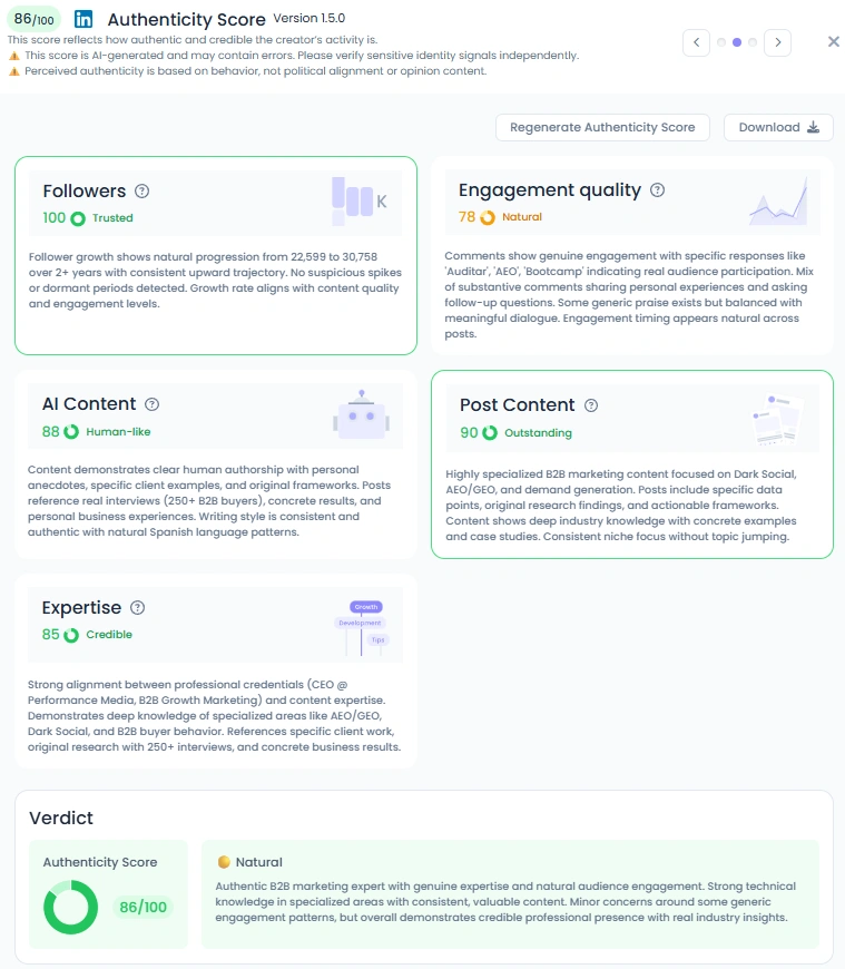 Con una puntuación de autenticidad de 86/100 en Favikon, la presencia en línea de Pablo es natural y sólida. Sus escritos se basan en historias reales de clientes, investigaciones y experiencias profesionales. No hay un lenguaje demasiado pulido ni un discurso de marketing vacío, solo ideas nítidas respaldadas por acciones. Su capacidad para comunicar ideas de marketing complejas en términos simples y humanos mantiene a su audiencia leal y comprometida.