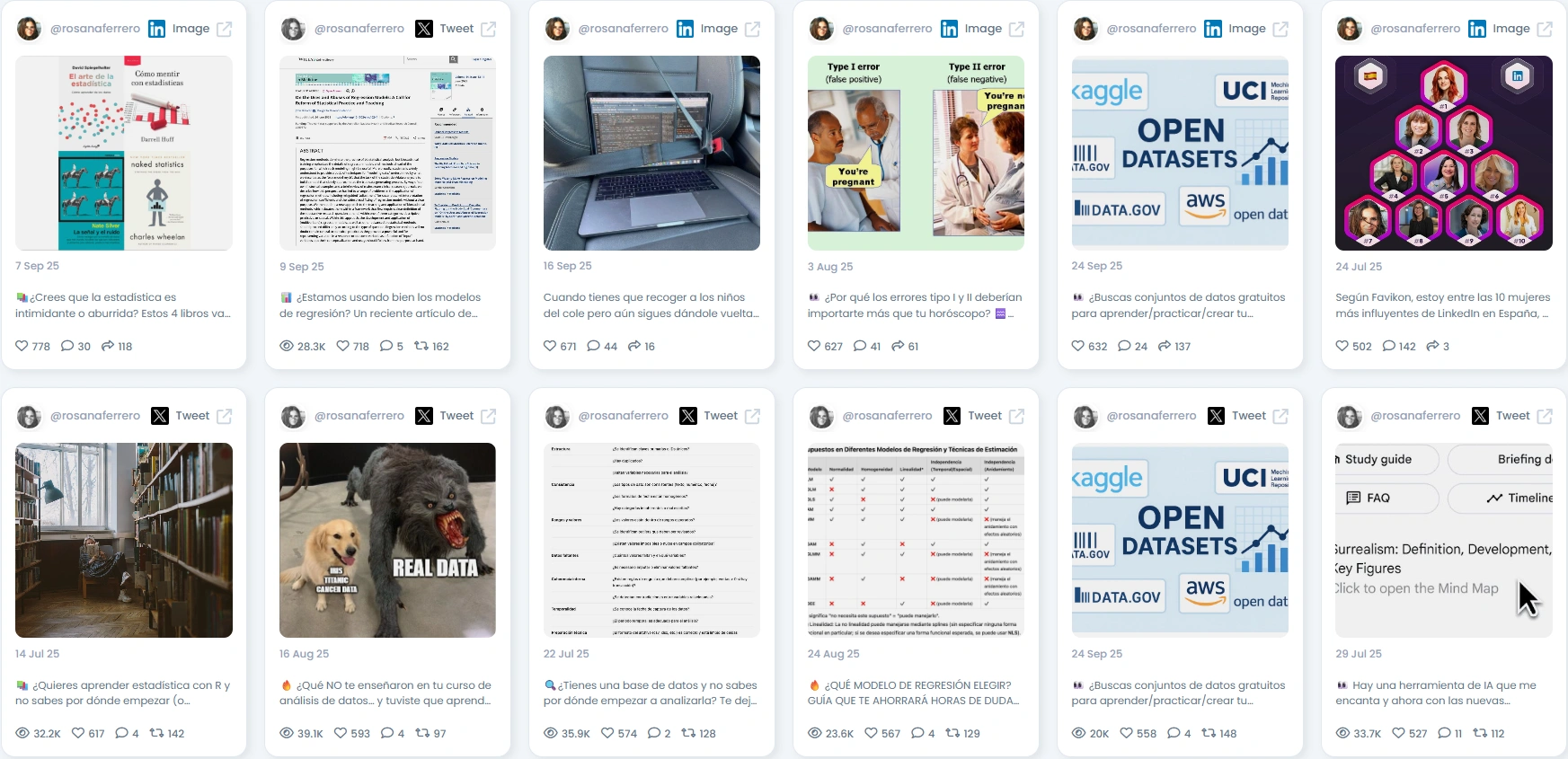 Los seguidores confían en Rosana porque hace que el conocimiento técnico sea identificable. Mezcla guías detalladas, recursos académicos y tutoriales de código con humor y anécdotas cotidianas que impresionan a su audiencia. Desde memes sobre «datos reales» hasta análisis detallados de las técnicas de regresión, equilibra la autoridad con la accesibilidad. Esta combinación hace que su contenido sea informativo y altamente compartible.