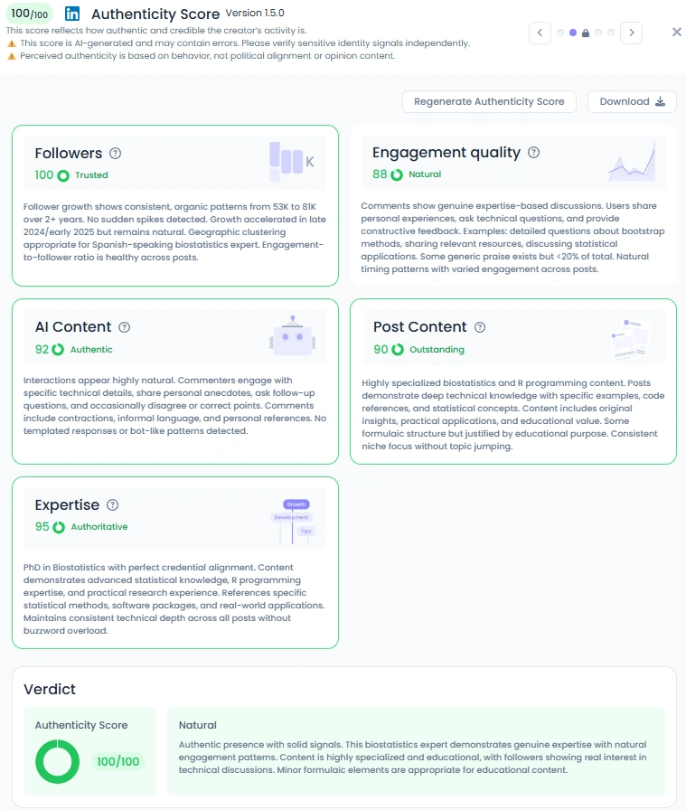 Rosana tiene una puntuación de autenticidad de 100/100 en Favikon, un claro reflejo de su credibilidad. Sus seguidores interactúan con ella de forma natural, a menudo haciéndole preguntas técnicas, compartiendo sus propias experiencias o debatiendo sobre métodos estadísticos. Publica no solo análisis profesionales sino también momentos humanos, como hacer malabares entre la paternidad y la programación, lo que demuestra a su audiencia que la experiencia no significa perfección. Esta mezcla de profundidad profesional y apertura personal es lo que hace que su voz sea tan auténtica.
