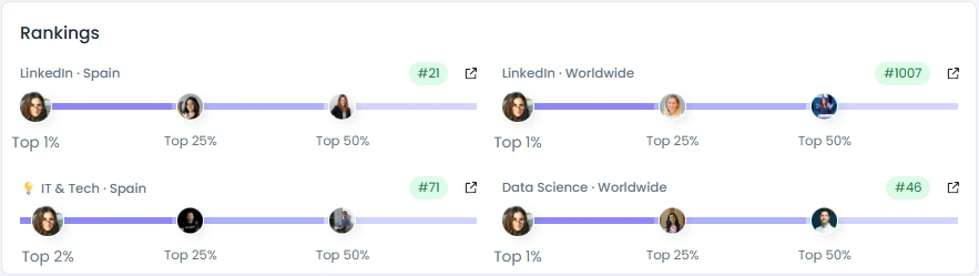 Con más de 81 000 seguidores y un crecimiento orgánico constante desde los 53 000, Rosana se ha asegurado una posición líder en el espacio de ciencia de datos de España. Tiene una puntuación de influencia de 8.097 puntos y se encuentra entre el 1% más alto del mundo en ciencia de datos. Su contenido genera miles de interacciones con regularidad, con tuits que suelen superar las 30 000 impresiones y publicaciones en LinkedIn que generan cientos de comentarios y debates. Su calidad de participación se sitúa en un saludable 88/100, lo que demuestra que su audiencia es activa, curiosa y altamente profesional.