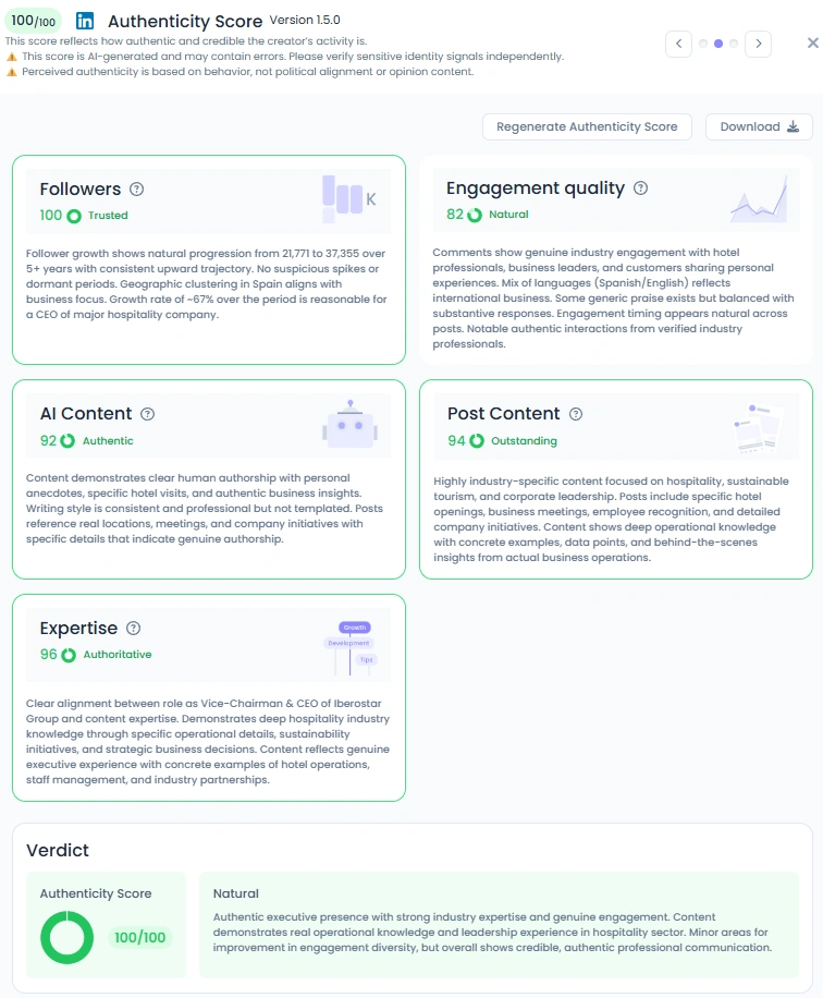 Favikon califica su autenticidad con un 100 sobre 100. Los comentarios muestran a los profesionales del hotel y a los clientes que comparten experiencias y puntos de datos específicos. Las señales de IA se leen como si fueran humanas, con detalles in situ y respuestas puntuales. El contenido de las publicaciones se sitúa en el 94 puesto y la experiencia en 96, lo que refleja un profundo conocimiento operativo y un liderazgo en sostenibilidad.