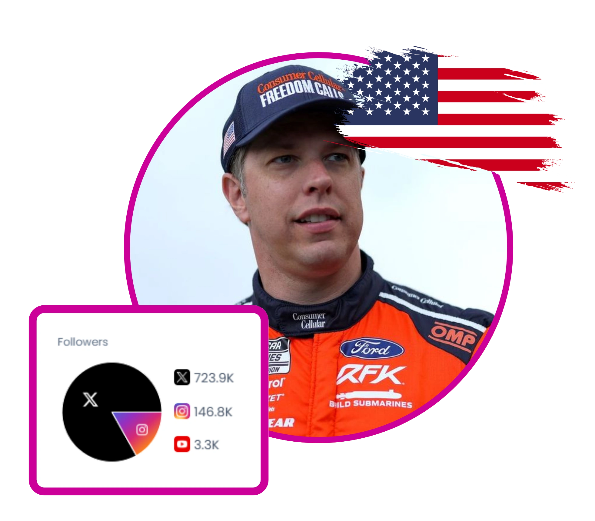 Brad Keselowski is a NASCAR champion, RFK Racing owner, and founder of the Checkered Flag Foundation and Kam Solutions. He shares race updates, rehab progress, family moments, and behind-the-scenes looks at racing, leadership, and philanthropy across Instagram, YouTube, and Twitter.