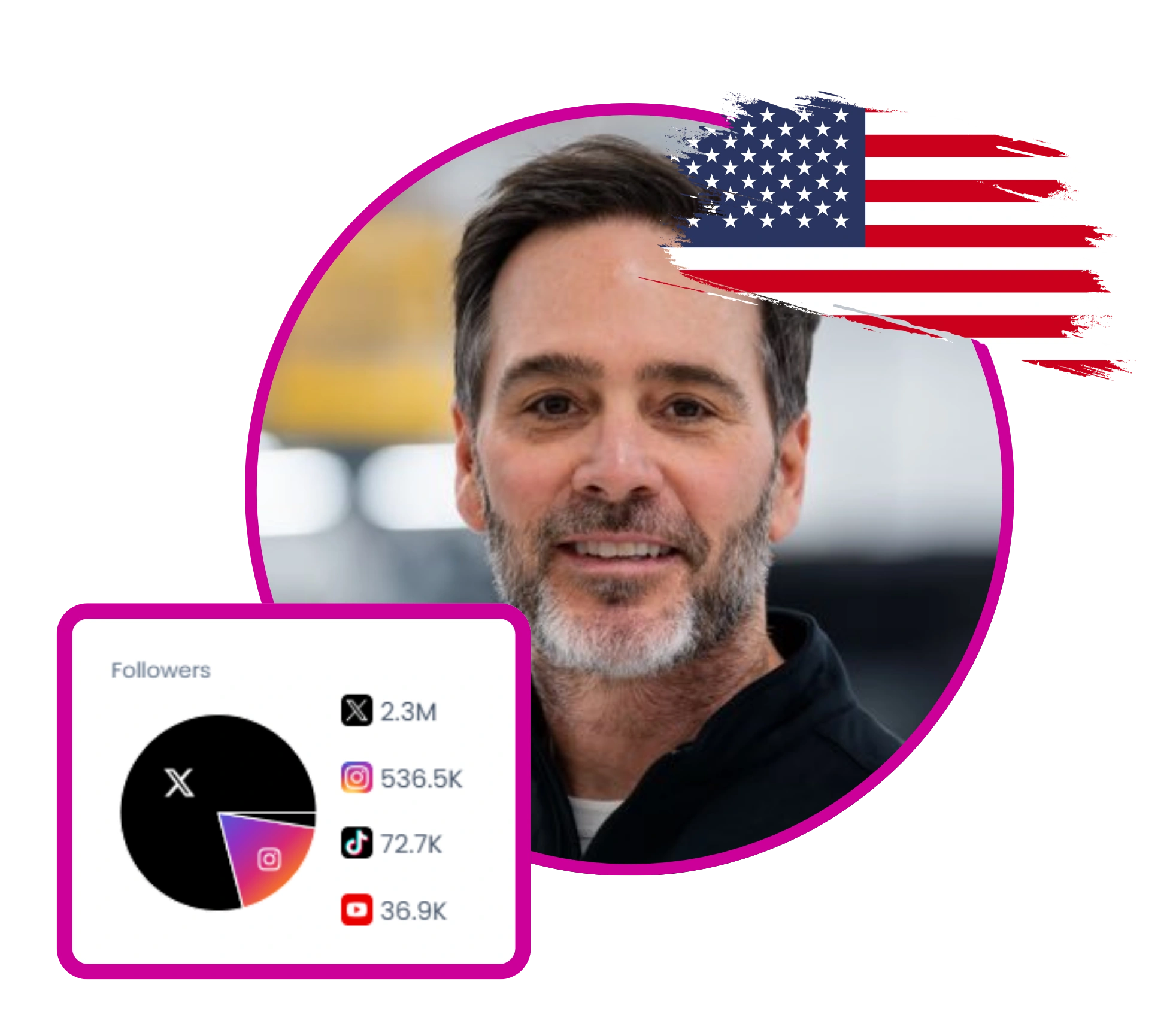 2-Time Dad, husband, racer, team owner and podcaster, Jimmie Johnson blends championship racing with family life and philanthropy. He shares race highlights, behind-the-scenes content, and charitable efforts across Twitter, Instagram, TikTok, and YouTube, highlighting veterans' tributes and motorsports heritage while promoting authentic, sponsor-friendly partnerships.