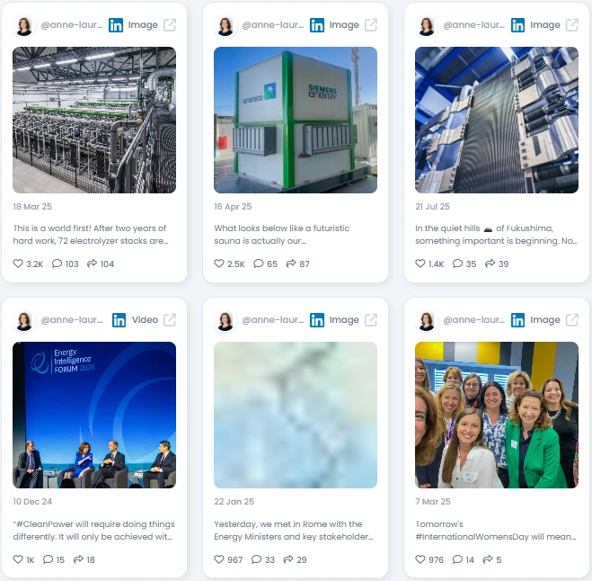 Anne-Laure de Chammard transforme l'industrie lourde en une histoire d'énergie propre que les gens ont vraiment envie de lire. En tant que vice-présidente exécutive de Siemens Energy, elle partage de véritables projets gagnants, des photos de sites et des chiffres précis qui concrétisent la décarbonisation.
