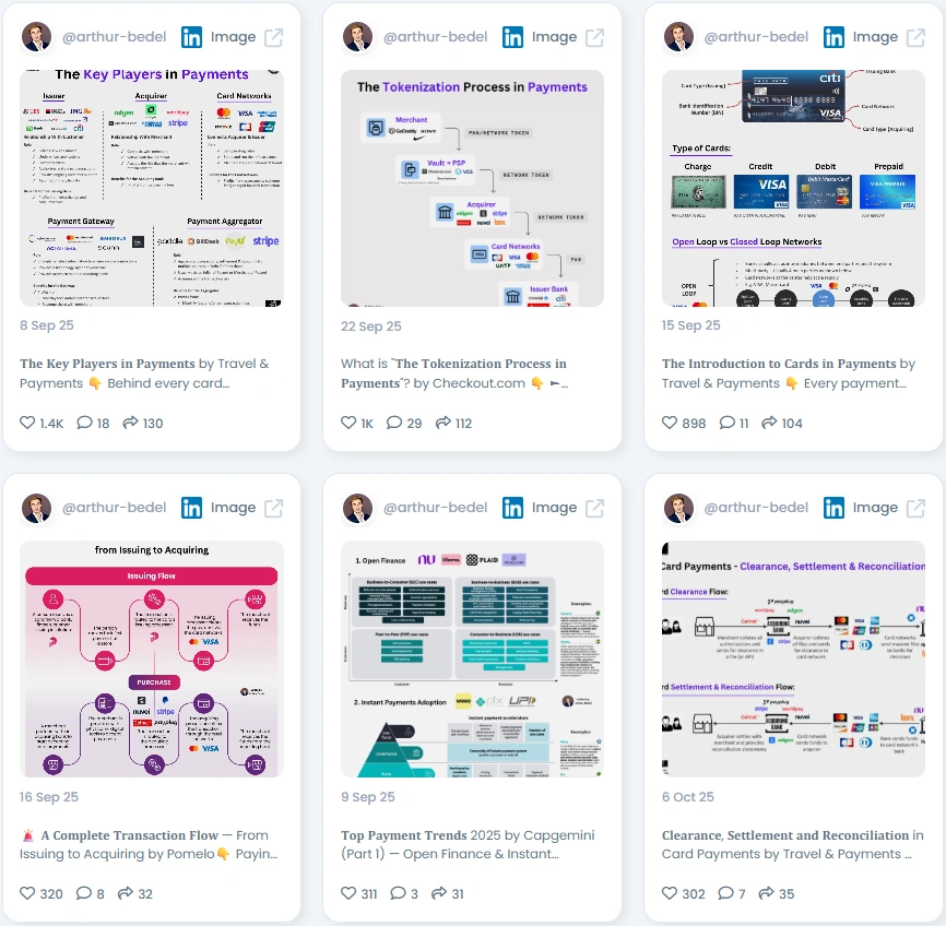 Arthur Bedel s'est fait un nom en transformant la complexité de la technologie financière en informations visuelles claires et compréhensibles pour tous. Qu'il s'agisse de détailler le processus de tokenisation ou d'expliquer comment les acquéreurs et les émetteurs interagissent, il fait en sorte que l'écosystème des paiements ressemble moins à un labyrinthe qu'à une carte.