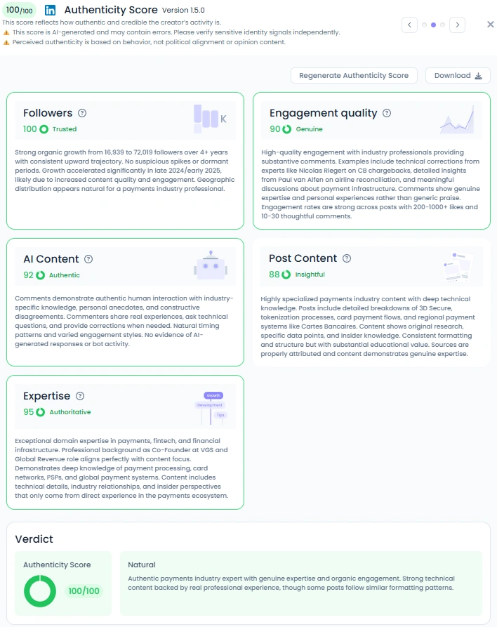 Avec une parfaite Score d'authenticité Favikon de 100/100, l'influence d'Arthur provient d'une véritable expertise et d'une communication transparente. Ses abonnés participent à des conversations constructives, proposent des commentaires, des corrections et des discussions fondées sur des expériences du monde réel. Il conserve un ton professionnel ouvert et accessible, démontrant que l'autorité ne doit pas nécessairement se faire au détriment de l'authenticité. La crédibilité d'Arthur repose sur des années d'expérience pratique et sur un effort constant visant à partager la valeur, et pas seulement la visibilité.