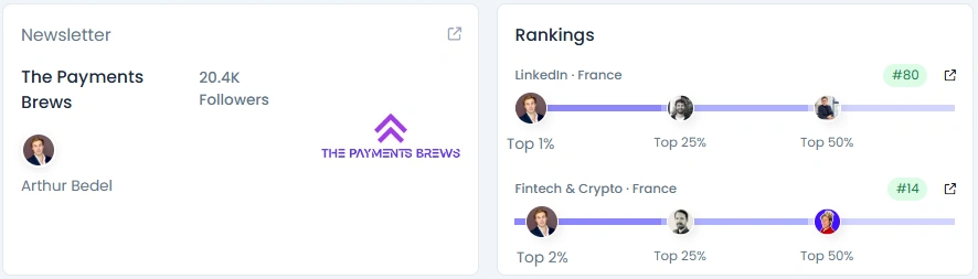 La présence d'Arthur continue de croître à un rythme impressionnant, atteignant plus de 72 000 abonnés sur LinkedIn et d'autres canaux, avec un engagement constant sur chaque publication. Le sien Score d'influence de 7 779 points le place dans le Top 1% des créateurs de LinkedIn en France et dans le Top 2% des FinTech & Crypto dans le monde. Ses visuels attirent régulièrement des centaines de likes et font l'objet de discussions détaillées, ce qui montre que son objectif de niche est à la fois respecté et pertinent au sein de la communauté mondiale des technologies financières.