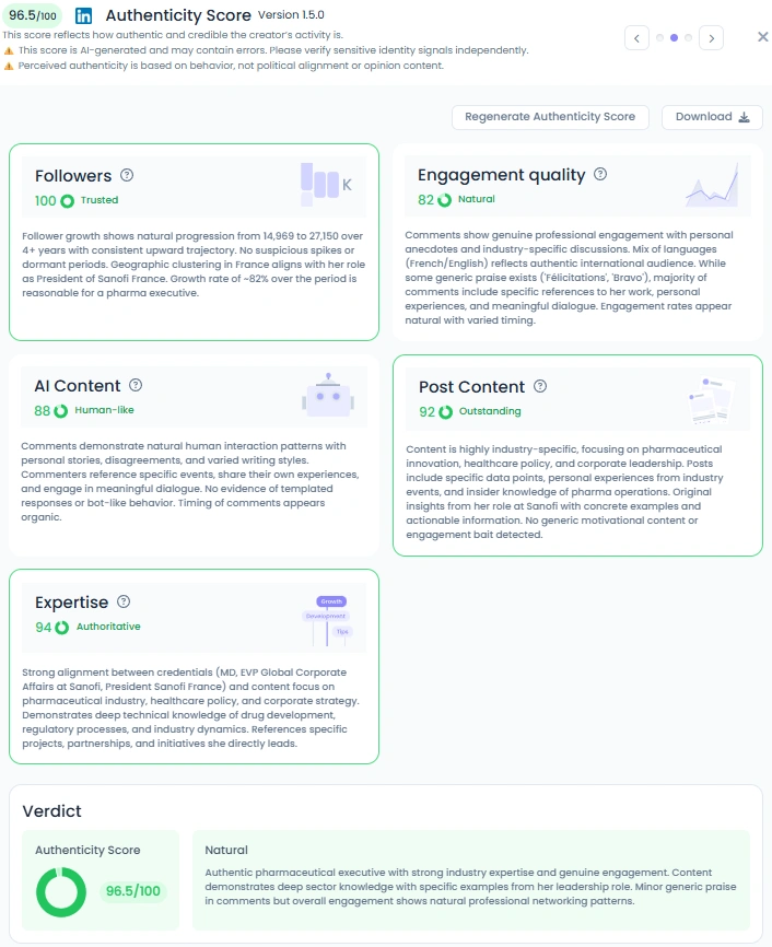Sa communauté LinkedIn concerne 27,1 K et en croissance à +1,43 %. Elle se classe dans 1 % des meilleurs des créateurs de LinkedIn en France et Les 4 % supérieurs dans Pharma et Biotech France, avec un #13 rang national et #300 dans le monde entier. Moyennes d'activité 6 publications par mois avec bon engagement. Les scores de Favikon Contenu de la publication 92, Expertise 94, et Qualité de l'engagement 82.