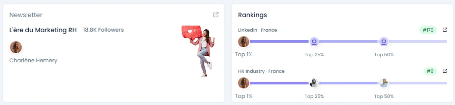 L'audience de Charlène est passée de 60,6K à 81,7K en six mois environ, avec une croissance hebdomadaire constante. Son score d'influence se situe à 7 996 points, avec Engagement Quality 88 et Post Content 85 pour plus d'informations. Elle se classe dans le Top 1 % sur LinkedIn en France (#170) et dans le Top 1 % du secteur des ressources humaines en France (#9). Le rythme de publication est constant et ancré dans des carrousels, des études de cas et des notes tactiques.