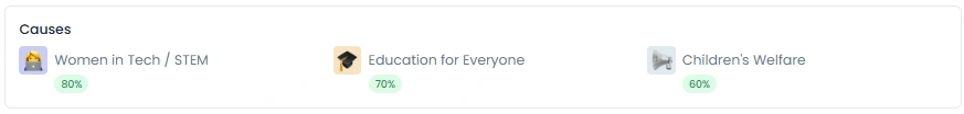 Charlène soutient les femmes dans les technologies et les STIM, l'éducation pour tous et le bien-être des enfants. Elle met en valeur les parcours professionnels des femmes, plaide en faveur d'un accès pratique à l'apprentissage et utilise sa plateforme pour rappeler au public les sujets relatifs à la prévention de la santé et à la famille. Les causes apparaissent naturellement dans son calendrier, souvent liées à des histoires personnelles ou à des initiatives communautaires.