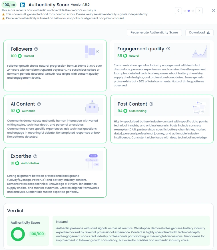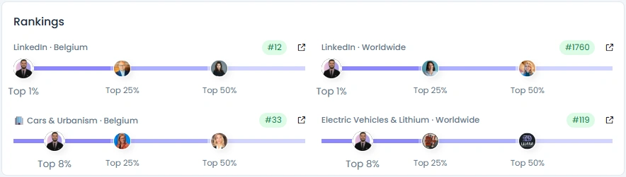 Chico a augmenté le nombre de ses abonnés LinkedIn de 21,8 000 à 31,5 000 en un peu plus de deux ans, avec une trajectoire constante et organique. Le sien Score d'influence se situe à 6 920 points, soutenu par une forte qualité d'engagement et un contenu hautement spécialisé. Classé #12 sur LinkedIn en Belgique et #119 dans le monde entier dans la catégorie Véhicules électriques et lithium, sa voix résonne clairement dans un créneau industriel compétitif.