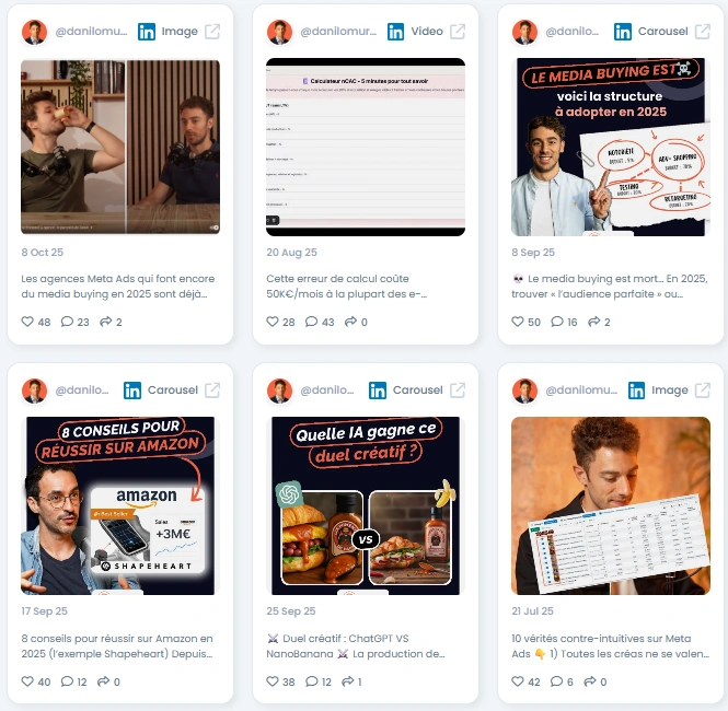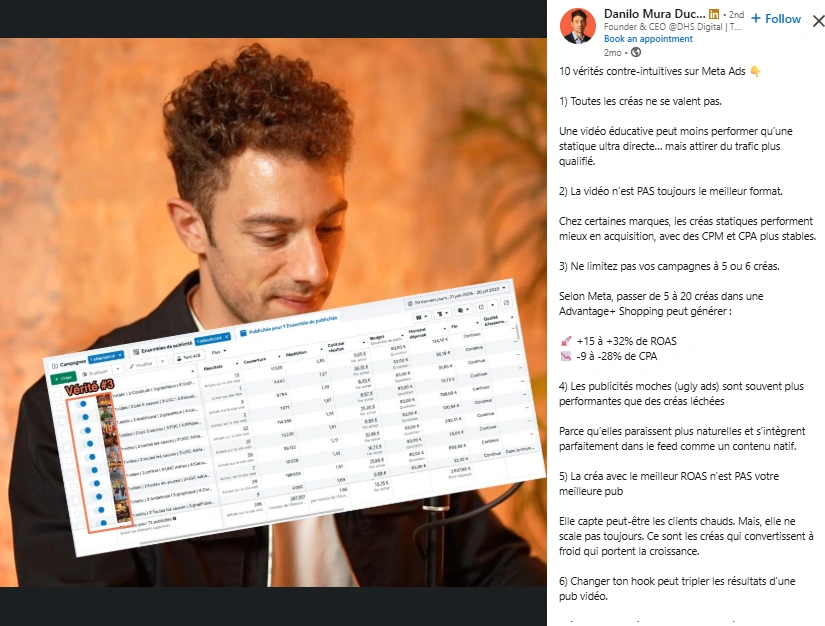 Danilo se situe au cœur de la communauté française de la performance. Vous apercevrez des opérateurs de Céos, Germinal, Koletiv et ECN sur son orbite, ainsi que des fondateurs, des créateurs et des prospects sociaux payants de marques DTC en pleine croissance. Il collabore souvent avec des dirigeants d'agences et des spécialistes du CRO, ce qui lui permet de donner des conseils basés sur des comptes réels, et non sur des diapositives.