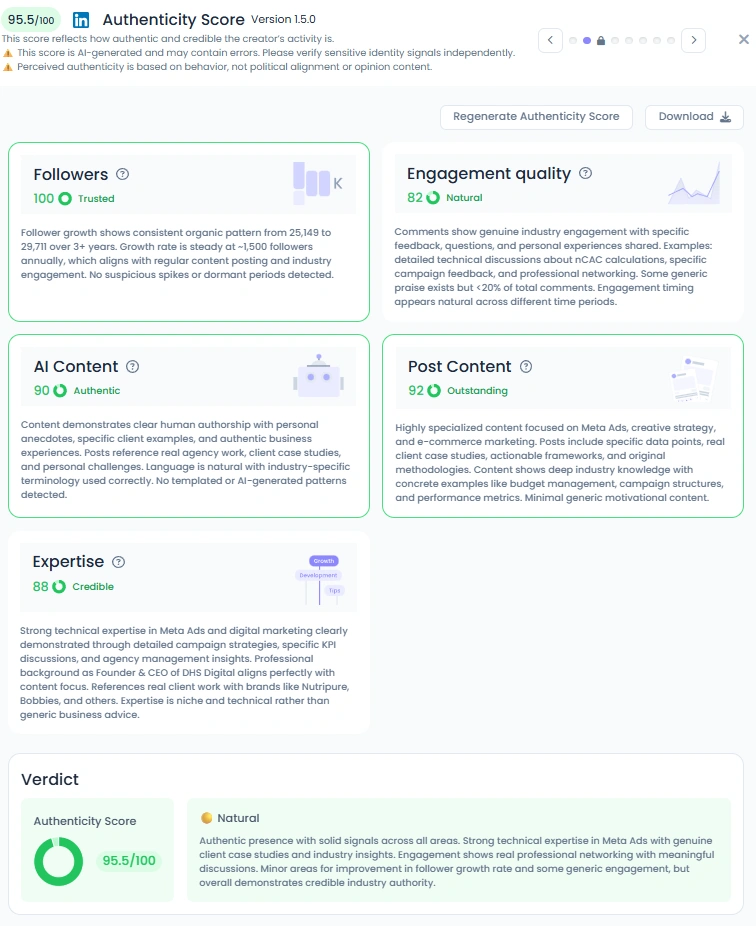 L'audience de Danilo a connu une croissance organique, passant de 25 000 à 29,7K en trois ans, avec une dynamique constante. Son score d'influence est de 6 396 points. La qualité du contenu est exceptionnelle à 92/100, tandis que la qualité d'engagement est de 82/100 et l'expertise de 88/100. Il publie régulièrement des articles sur des carrousels approfondis, des vidéos explicatives rapides et des clips de podcast qui permettent de faire tourner le volant.