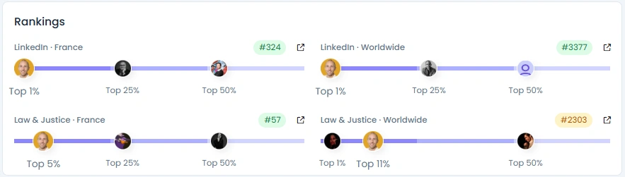 Jean-Julien réunit 44,2 K abonnés sur LinkedIn avec un taux d'abonnés stable +0,54 % croissance. Il publie à propos de 13 fois par mois et soutient bon engagement à travers des carrousels et des diagrammes. Il se classe dans 1 % des meilleurs sur LinkedIn en France (#324) et Les 5 % supérieurs dans Droit et Justice France (#57), avec un solide classement mondial. Son score d'influence se situe à 5 avec 6 497 points.