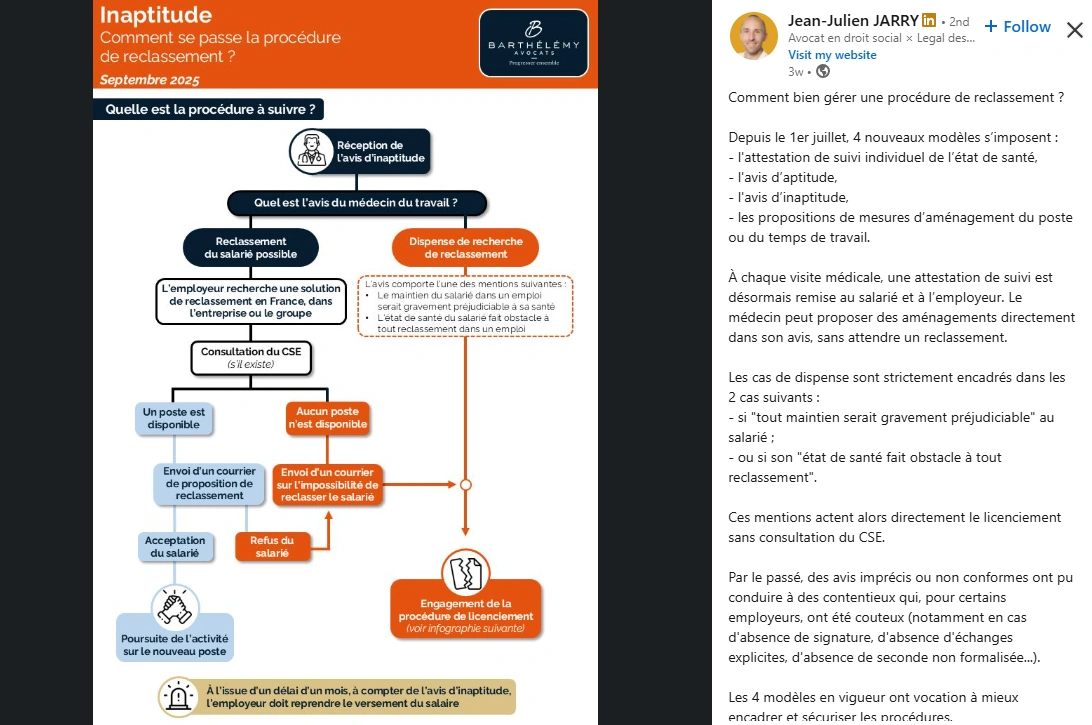 Jean-Julien Jarry est expert en design juridique et avocat en droit du travail chez Barthélémy Avocats. Il est spécialisé dans le droit social français et les problèmes pratiques auxquels les responsables des ressources humaines sont confrontés chaque semaine. Il crée des infographies, des livres électroniques et des webinaires qui décryptent les procédures, les délais et la jurisprudence. Son objectif est simple. Rendez la règle compréhensible et aidez les équipes à l'appliquer en toute confiance. Il se positionne comme le guide de référence entre la doctrine, les tribunaux et le monde du travail.