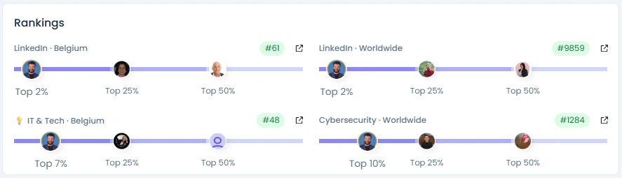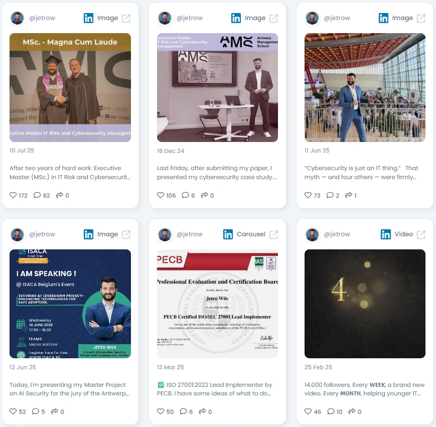 Jetro possède un score d'influence de 4 878 points, se classant dans le Top 2 % sur LinkedIn en Belgique et dans le Top 10 % en matière de cybersécurité au monde. Sa base d'abonnés a augmenté de façon organique, passant de 13 000 à plus de 17 000, grâce à des publications éducatives constantes et à une participation à des événements. Avec un score de qualité d'engagement de 82 et un score de 92 pour le contenu des publications, l'influence de Jetro repose sur son expertise et non sur des algorithmes. Son rythme de publication régulier lui permet de rester visible et respecté au sein de la communauté européenne de la cybersécurité.