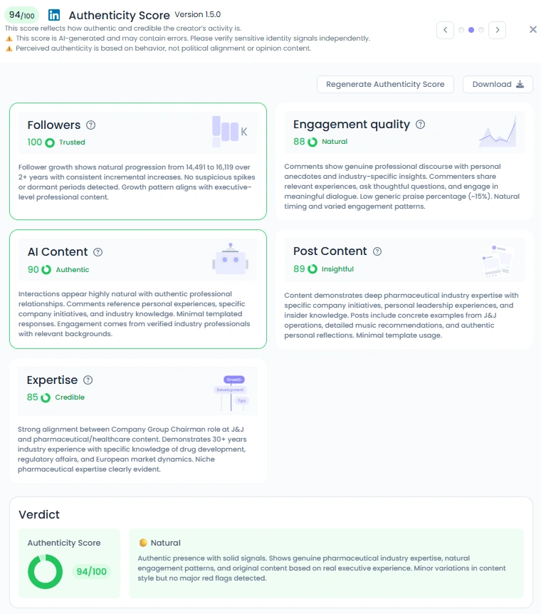 Son score d'influence se situe à 5 543 points avec une croissance du nombre d'abonnés de 14,5 km pour 16,1 k sur deux ans, propre et uniforme. Qualité de l'engagement est 88, avec des publications régulières suscitant des centaines de réactions de la part de voix vérifiées de l'industrie. Scores du contenu des publications 89 pour plus de profondeur et de spécificité. Le classement le place dans Les 4 % supérieurs sur LinkedIn en Belgique et Les 5 % supérieurs dans le monde entier.