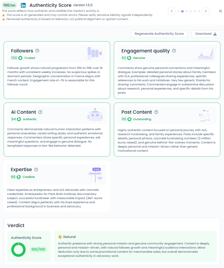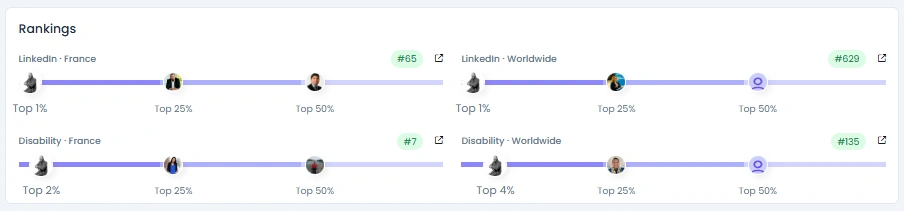 Score d'influence : 8 310 points. Le nombre d'abonnés est passé de 95 000 à 118 000 en 18 mois, avec une croissance hebdomadaire saine. La qualité du contenu reste élevée avec Engagement 92, AI Content 94, Post Content 95 et Expertise 88. Il se classe #65 sur LinkedIn France et #7 dans Disability France, avec une solide réputation mondiale.