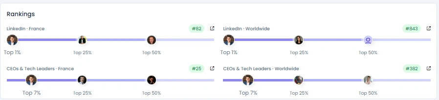 Ses abonnés sont passés de 31 000 à 64 000 en un peu plus de deux ans, avec une dynamique fluide et organique. Il a un score d'influence de 7 599 points et se classe dans le top 1 % sur LinkedIn en France et dans le top 7 % des PDG et leaders technologiques français. La qualité de l'engagement est forte, grâce à des professionnels du secteur et à un dialogue constructif. Le rythme de publication est constant en fonction des jalons commerciaux et des mises à jour de l'entreprise.