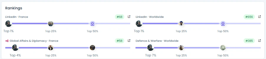 Avec plus de 56 000 abonnés et une trajectoire de croissance constante, l'influence de Pierre continue de s'étendre au-delà de la communauté de la défense. Son score d'influence de 7 520 points le place dans le Top 1 % sur LinkedIn France et dans le Top 7 % mondial en matière de défense et de guerre. Chaque publication atteint des milliers de personnes, générant souvent des centaines de commentaires qui allient respect et perspicacité. Son taux d'engagement prouve que l'authenticité et l'autorité peuvent coexister et prospérer même dans des secteurs formels tels que la défense nationale.