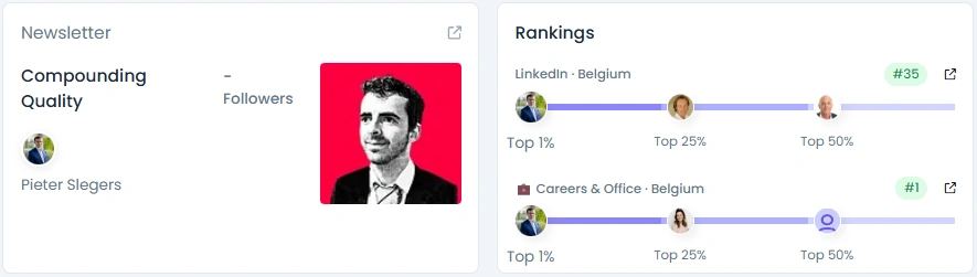 Pieter compte plus de 273 000 abonnés sur LinkedIn, soit une croissance constante d'environ 4 800 nouveaux abonnés par mois. Avec un Score d'influence de 8 277 points, il se classe dans le Top 1 % sur LinkedIn Belgium et dans le Top 20 mondial en matière de finance d'entreprise. Ses publications suscitent régulièrement un fort engagement avec des centaines de commentaires et des milliers de réactions, ce qui prouve que son contenu touche les professionnels et les étudiants du monde entier.