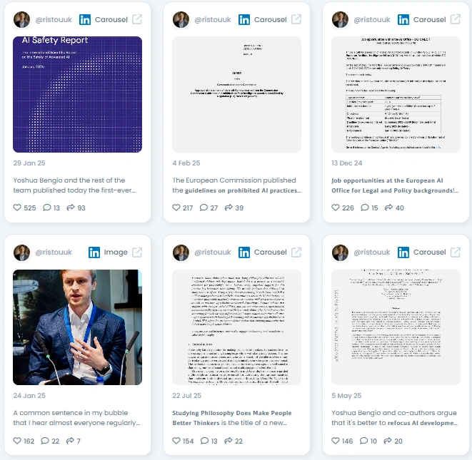 Risto Uuk transforme une réglementation dense en directives claires. Il écrit avec précision et sur un ton calme qui invite à un véritable débat. Ses articles mêlent des détails de la loi européenne sur l'IA, des notes de recherche et des observations de terrain. Si vous préférez le signal au bruit, vous suivez Risto.