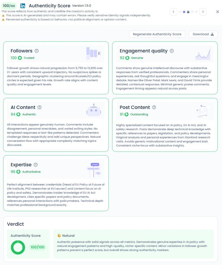 Risto possède un score d'authenticité de 100 sur 100. Qualité de l'engagement 92 Genuine montre un débat réfléchi mené par des professionnels vérifiés. Contenu IA 94 Contenu authentique et contenu publié 91 exceptionnel reflètent une voix humaine cohérente et des recherches approfondies. Expertise 95 Autoritative correspond à son rôle politique et à l'analyse publiée. L'alimentation évite le battage médiatique générique et reste axée sur la substance.