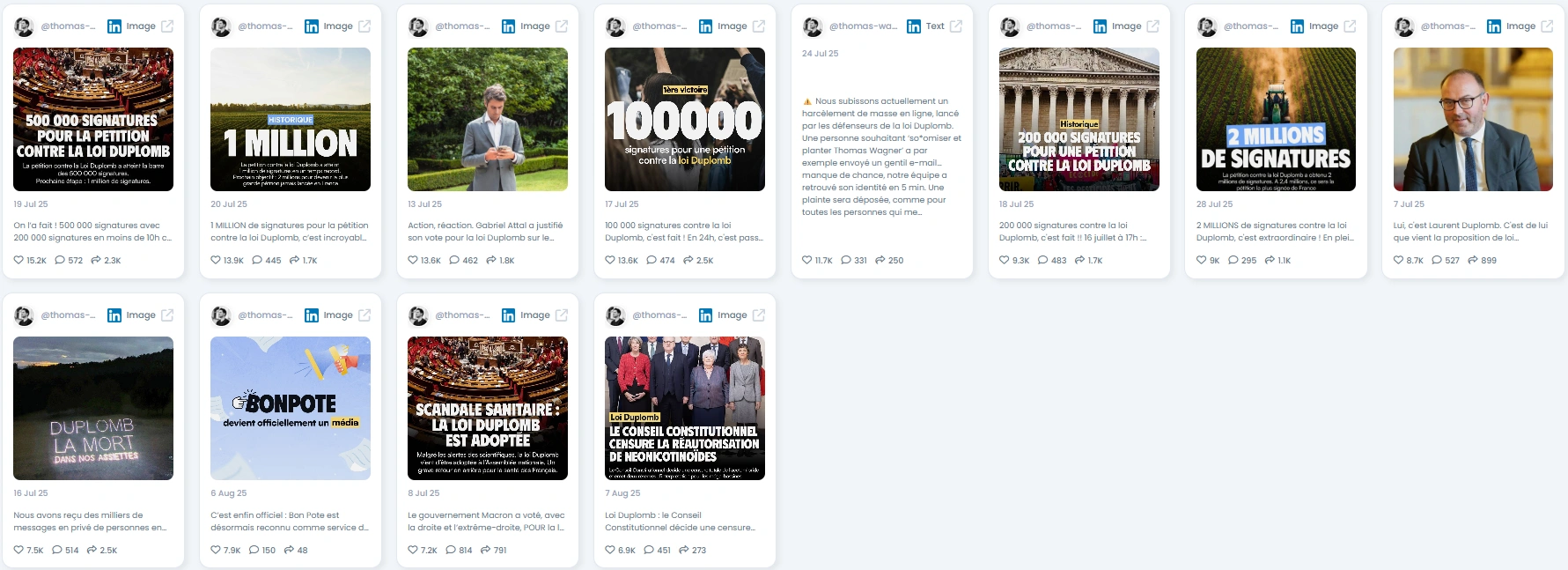 Thomas Wagner est le fondateur de Bon Pote et l'une des voix françaises les plus actives en matière de climat sur LinkedIn. Il transforme des études complexes en mises à jour claires sur lesquelles les gens peuvent agir. Ses publications suscitent le débat, mobilisent des signatures et font pression sur les décideurs. Si la politique climatique vous intéresse, Thomas est déjà sur votre fil d'actualité.