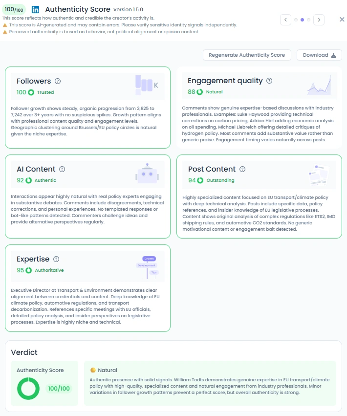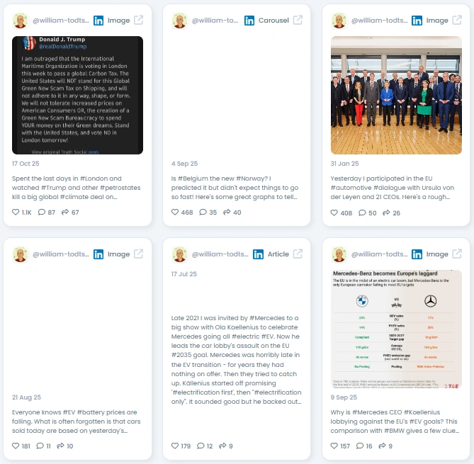 William Todts traduit la politique climatique complexe de l'UE en langage clair et en actions. Il le fait à l'aide de données, de reçus et d'une approche audacieuse de la pression du lobbying. Ses publications se lisent comme des briefings depuis la salle de négociation. Les gens le suivent pour comprendre ce qui va réellement façonner la transition des transports en Europe.