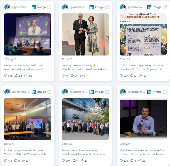 Yasmine est immunologiste et présidente de Institut Pasteur à Paris. Auparavant chercheuse senior aux États-Unis, elle est retournée en France pour diriger la mission mondiale de Pasteur dans les domaines des maladies infectieuses, de la microbiologie et de la santé publique. Parmi ses jalons, citons l'élection de La Royal Society, des contributions majeures à la recherche sur le microbiome hôte et la création de passerelles entre la science fondamentale et les politiques. Sur LinkedIn, elle met en avant de nouveaux articles, des initiatives interlaboratoires et lance des appels à des stagiaires, en créditant toujours les équipes. Elle se positionne comme une scientifique en chef qui pense toujours comme un mentor.