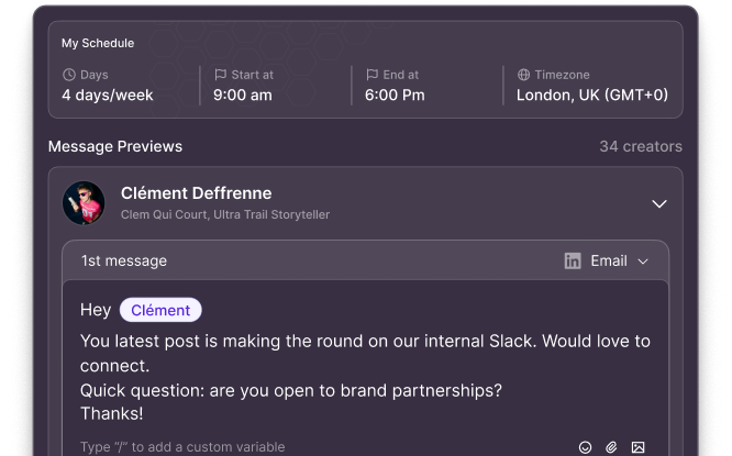 Yes. FavAI analyzes each creator's content and writes personalized messages based on the shared value between your brand and the creator. No templates, no copy-pasting.