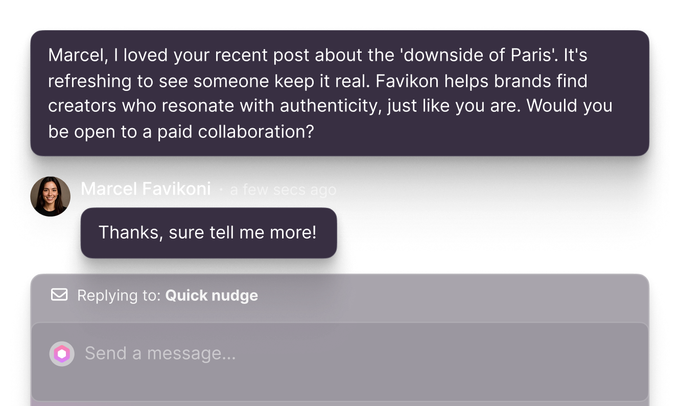 You can contact creators across four channels: email, social media DMs and Favikon DMs. All from the same campaign, in a single automated sequence.
