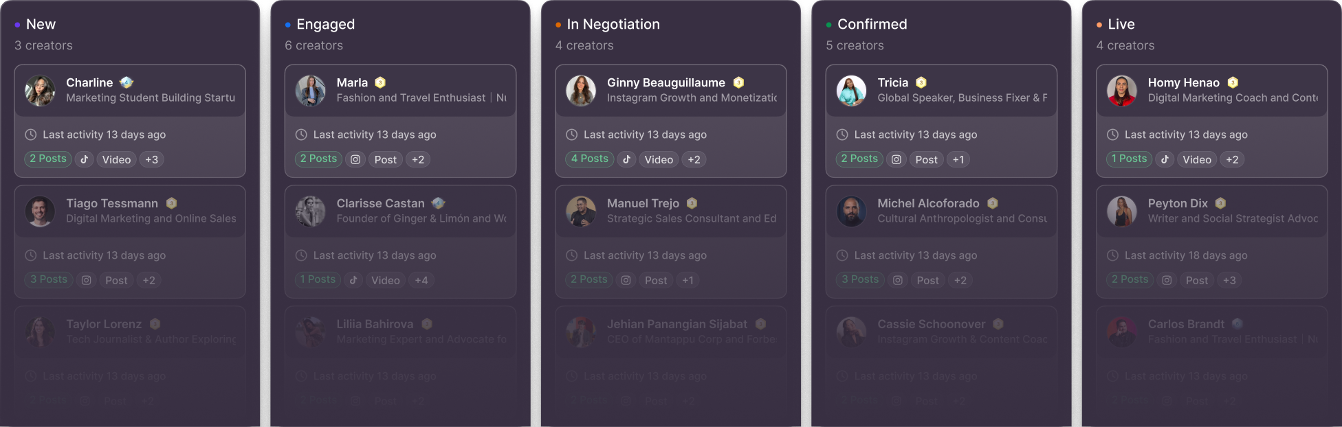 Engage creators across multiple channels, manage pipelines in one place, track posts automatically, and see if it actually worked.